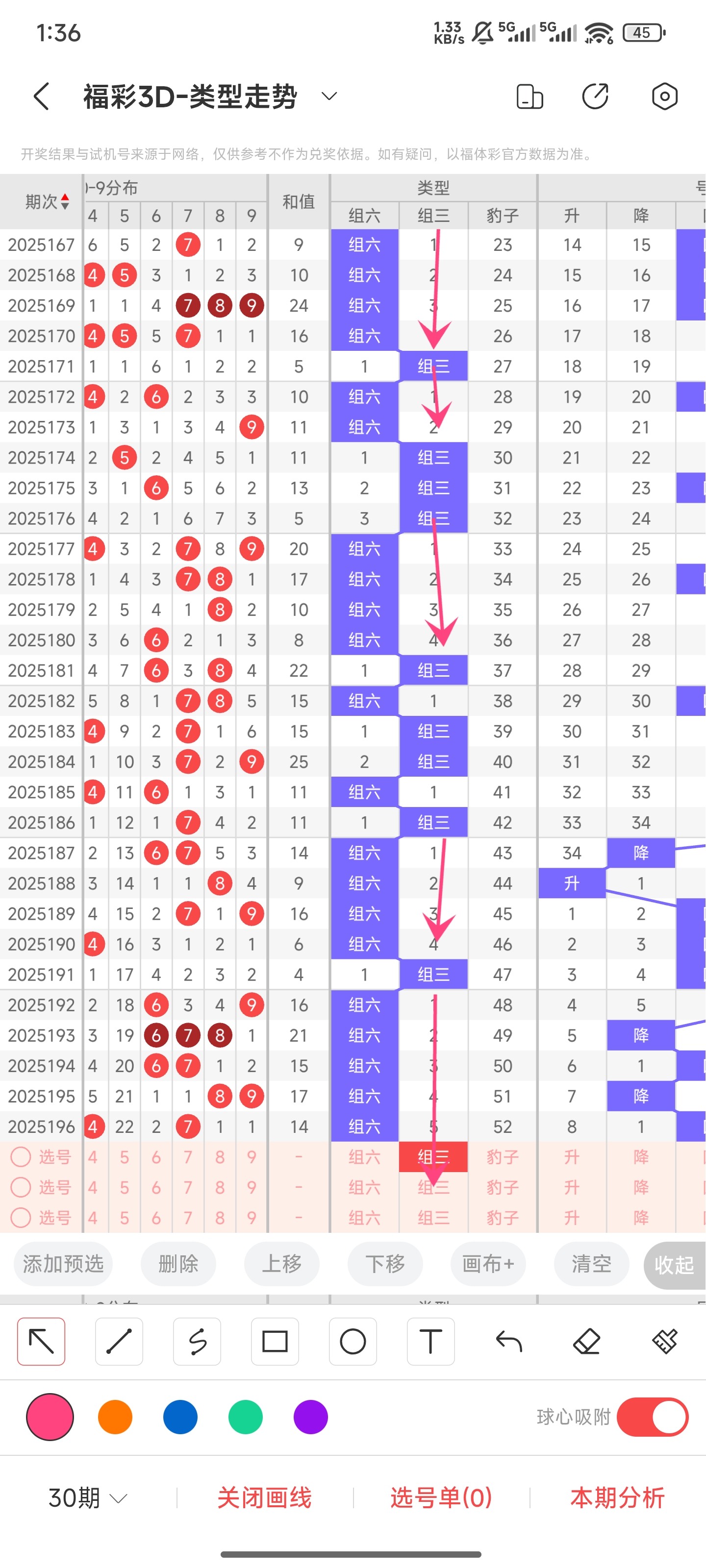 上期开出了组六类型,往前一期也是组六,组六已经连续开了五期,通过分析最近30期内的类型数据,组三最大遗漏是5期,平均遗漏是2期,那么本期组三就有比较大的可能回归。所以推测本期有可能会开组三类型。