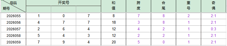 2026055期开奖号码107,我们可以看出近30期百位1出现6次(较057期减一),十位0出现3次(较059期减一),个位7出现4次。