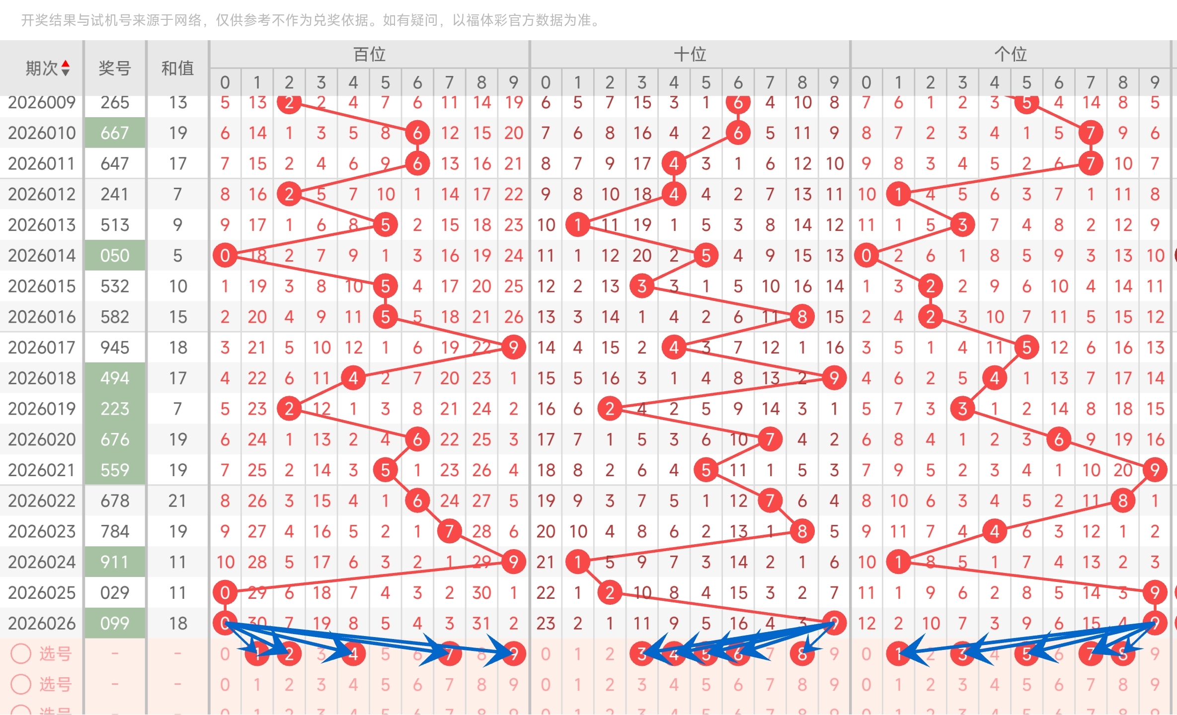 第2026018期福彩3D分析文章,5码定位和复式命中494,百位个位胆码命中4。