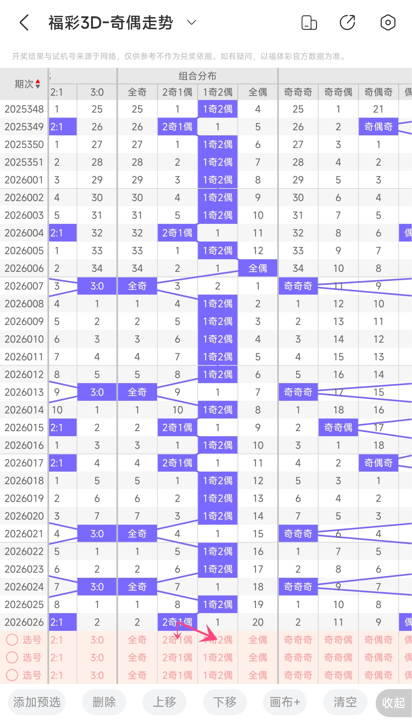 上期开了2奇1偶的情况,往前一期开出的是1奇2偶。从组合数学理论上来讲,开出2奇1偶和1奇2偶的概率都为37.5%,开出全偶和全奇的概率为12.5%。通过分析目前30期内的数据。本期的开出全偶的概率是3.33%,开出全奇的概率为13.33%,开出1奇2偶的概率为66.66%,开出2奇1偶的概率是16.66%。和前一期相比,概率没有变化。通过走势图分析,本期看好2奇1偶继续回补。所以本期推测可能开2奇1偶,其次是1奇2偶,然后是全奇或者全偶类型。