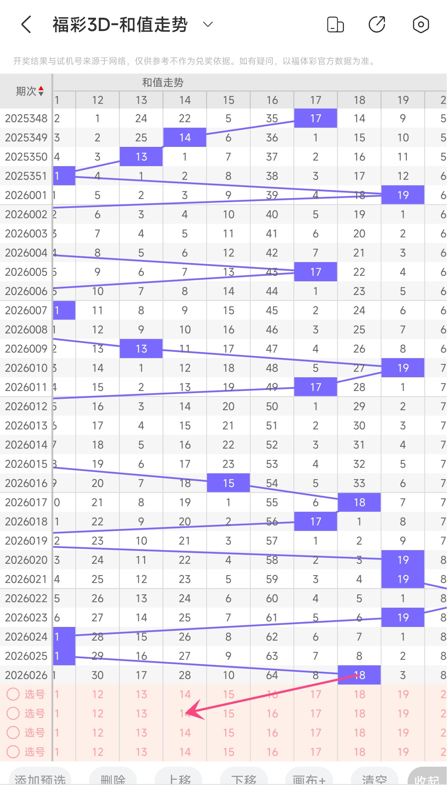 上期和值是18,往前一期和值是11。和值往右移动,偏移振幅为7。18和值是处于近30期内开出比较大的和值。上升的空间比较小,下降的空间比较大,所以推测本期趋势是大概率变往左,和值变小,小概率往右,和值变大。