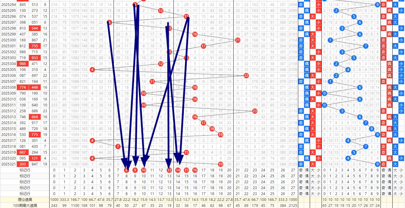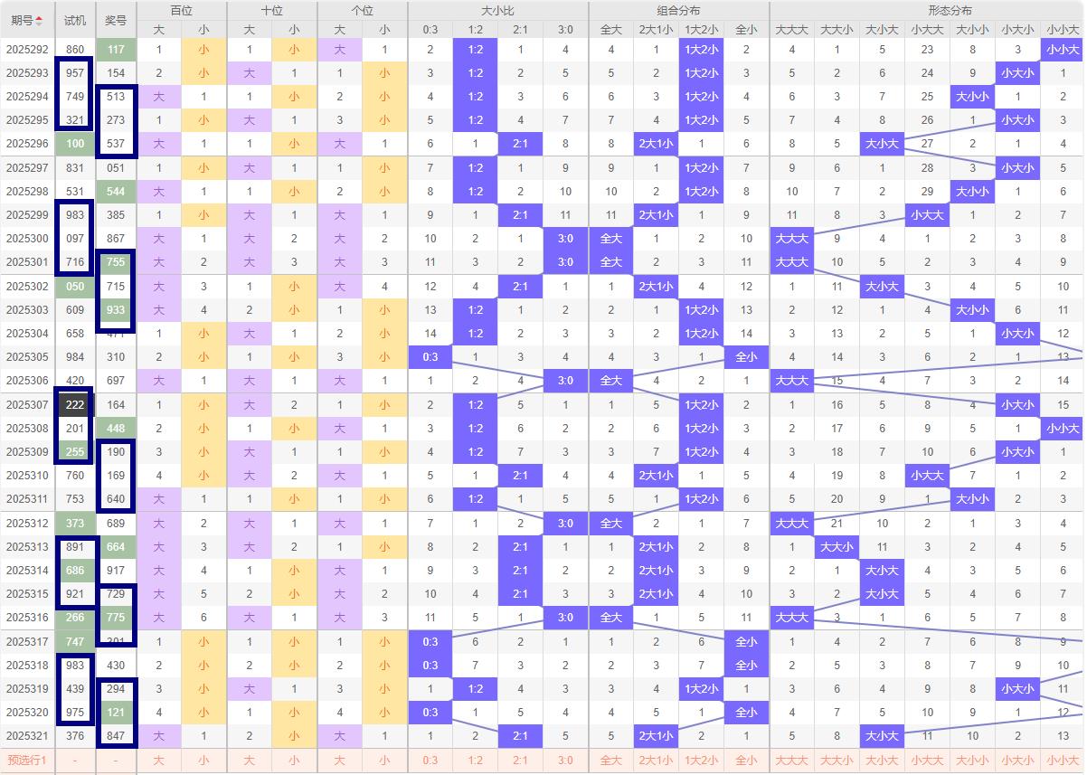 大小走向分析: 在福彩3D中,大小走势是判断号码分布的重要依据。根据321期开奖结果847,大小比为2:1;形态偶偶奇形态。结合历史走势图,发现近10期大小比例为15:15,大数与小数保持平衡;因此,322期关注的大小比例可以是2:1或者1:2,可能会出现一个大奖号和两个小奖号,应充分考虑这一趋势,合理分配投注比例。防两小一大号码.