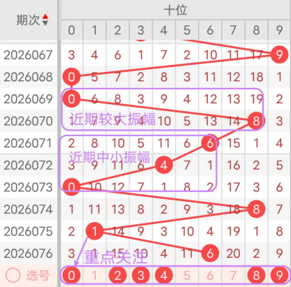 7期(070~076)开奖号十位号码球分别为8、6、4、0、8、1、6,开奖号与上一期走出的振幅分别为8、2、2、4、8、7、5。070期走出8号大数号码球,走出“8”的大幅度,071期走出6号中大数号码球,走出“2”的小幅度,072期走出4号中小数号码球,走出“2”的小幅度,073期走出0号小数号码球,走出“4”的中小幅度,074期走出8号大数号码球,走出“8”的大幅度,075期走出1号小数号码球,走出“7”的大幅度,076期走出6号中大数号码球,走出“5”的小幅度;从振幅大小及走势图的整体对应来看,中大振幅走在4~6之间较为适宜,中小振幅走在2~3之间较为适宜;结合走势图的上下对应及振幅大小分析,本期十位应重点关注号码球为0、2、3、4、8、9