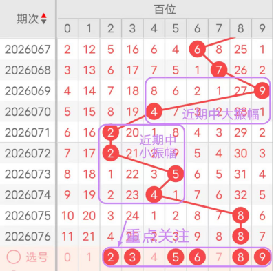 7期(070~076)开奖号百位号码球分别为4、2、2、5、4、8、8,开奖号与上一期走出的振幅分别为5、2、0、3、1、4、0。070期走出4号中小数号码球,走出“5”的中大幅度,071期走出2号小数号码球,走出“2”的小幅度,072期走出2号小数号码球,走出“0”的小幅度,073期走出5号中大数号码球,走出“3”的中小幅度,074期走出4号中小数号码球,走出“1”的小幅度,075期走出8号大数号码球,走出“4”的中小幅度,076期走出8号大数号码球,走出“0”的小幅度;从振幅大小及走势图的整体形势,中大幅度走在5~6之间较为适宜,中小幅度走在0~3之间较为适宜;结合走势图的整体及大小走势分析,本期百位需重点关注号码球为2、3、5、6、8、9
