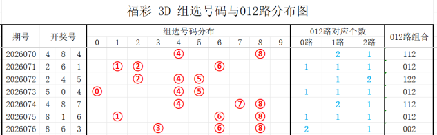 7期(070~076)开奖号与012路组合分别为484(112)、261(012)、245(122)、504(012)、487(112)、816(012)、863(002)上期开奖号为012路组合,根据整体走势分析,本期看好的012路组合有:001、012、000,022、011、002组合。