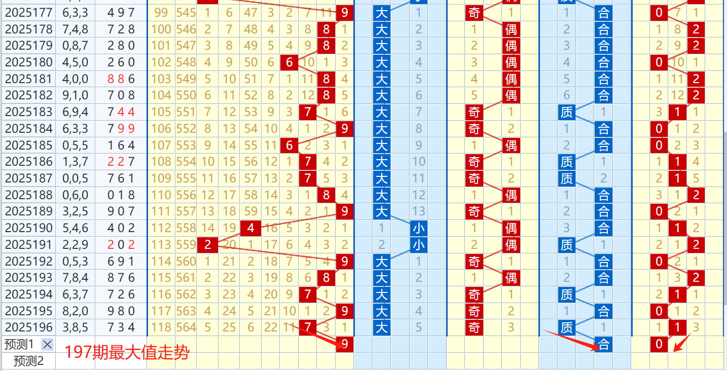 上期开出734,五行分布木水火,百十位差值4,最小值振幅3,根据近期最大值和最小值走势规律分析,最大值振幅近期最大遗漏是三期,最小值最大连出是三期,最小值振幅主要以02路交替为主,本期最小值预计要往上提升,那么意味着和值将要走大,根据近期百位十位开出双码走势可见开出组合有:49对码,77组三,金木组合,根据上期开出的形势来看,本期百位预计会围绕着小质数为主出号,主防遗漏7的2路回补;