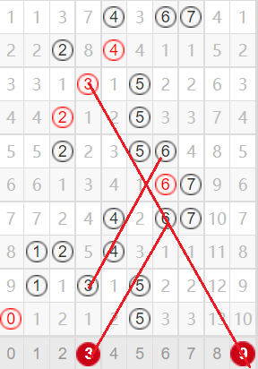 结合组选号码分布走势图可见,0路0、3、6、9)呈现明显斜对称规律:一方面“3-6-(9)”的斜连结构中,9的出号概率较高;另一方面“9-6-(3)”的斜连结构中,3的出号概率较高。