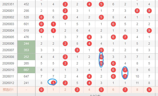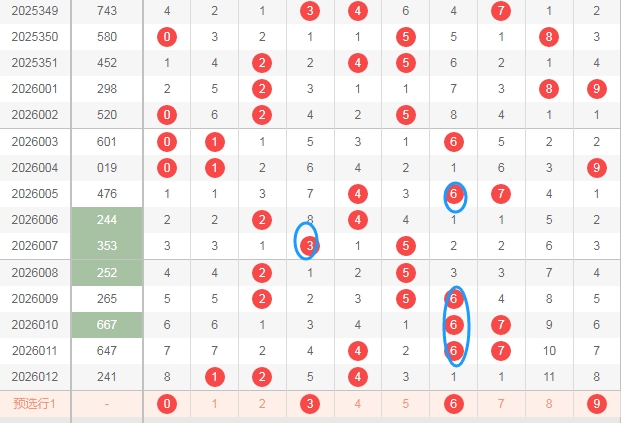 这是福彩3D开奖号码分布走势图,我在上面走势图中标注的数字都是0路球数字0 3 6 9,我在上面用蓝色圈圈标注的都是0路球数字,可以发现最近几期开奖号码中0路球数字并不多,而上期开奖号码214是直接一个0路球数字都没有,那么本期个人观点就是0路球的数字0 3 6 9至少得关注出1个。