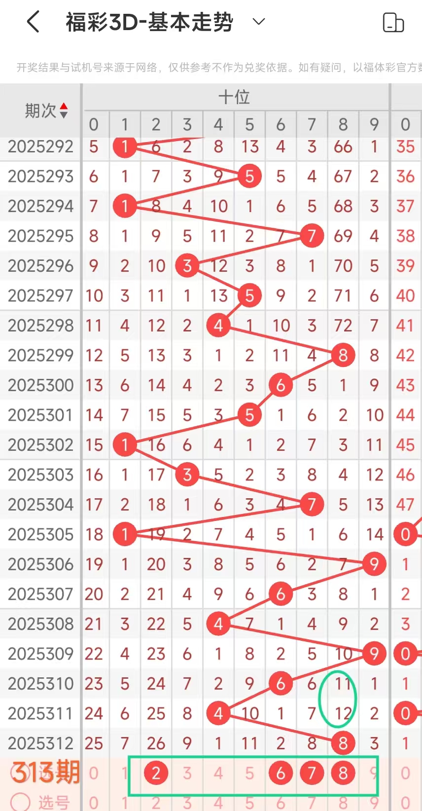 2、当十位开出8后下期开出:216,经统计0号出0次、1号出现1次、2号出现1次、3号出现0次、4号出现0次、5号出0次、6号出现1次、7号出现0次、8号出现0次、9号出现0次。观察发现126号趋势好,本期可以考虑。