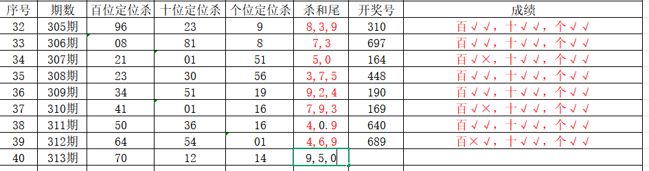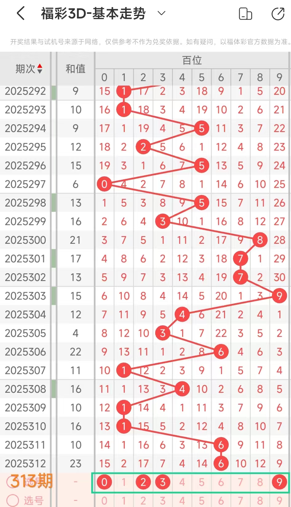 我们选取上期开奖号码689、在一起彩APP上截取前100期的数据,分别记录当开出百6、十8、个9、后下期开出什么号记录下来,然后一一分析。