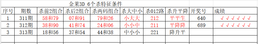 金莱3D第313期:本期形态看组六,和值主看单数