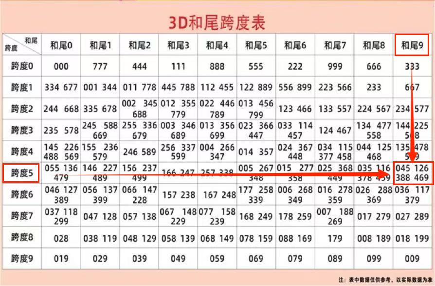 最后分享一个实用的3D和尾值与跨度值组合统计表。组合号码时,根据推测的和尾值结合跨度值,查找统计表上推荐的组合号码。以26027期为例:和值尾9、跨度值5,在统计表上查找的组合号码有:045/126/388/459,其中组合号码中出126(开奖号码126)。特别注意:统计表上推荐的组合号码,不是直选号码,不定位百十个位的顺序。仅供参考。
