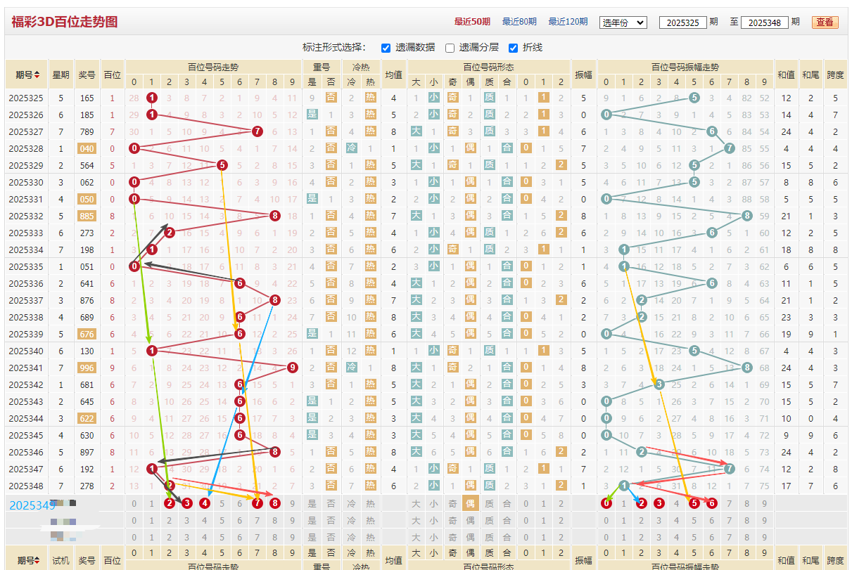 百位近期走势:1/0/6/8/6/6/1/9/6/6/6/6/8/1/2,连续出五期合数又开出6期合数,6最近太热本期不想考虑,见上图振幅黄色线1/3/5等隔下来对应数字7,红色线27和16等隔下来对应数字8,左边黑色线6123和8123同形态,蓝色线8/6/4,黄色线5/6/7,绿色线0/1/2都是等隔下来,综合上述百位推荐:23478