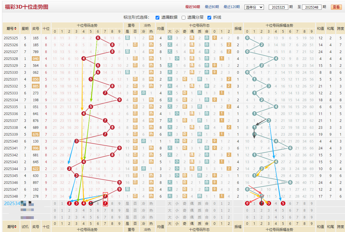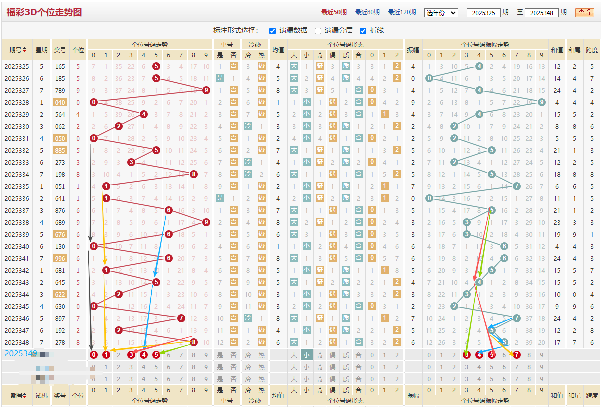 十位近期走势:9/5/4/7/8/7/3/9/8/4/3/2/3/9/9,大数占优开出9期,质数开出11期,小数急需回补本期重点,见上图振幅黑色线311和022等隔开出对应数字5,黄色线421和023等隔下来对应数字4,蓝色线3/4/5对应数字2,红色线020等隔下来对应数字7,左边黄色线4444依次递减,绿色线6543依次递减,蓝色线32/32等隔开出,综上图十位推荐:23457