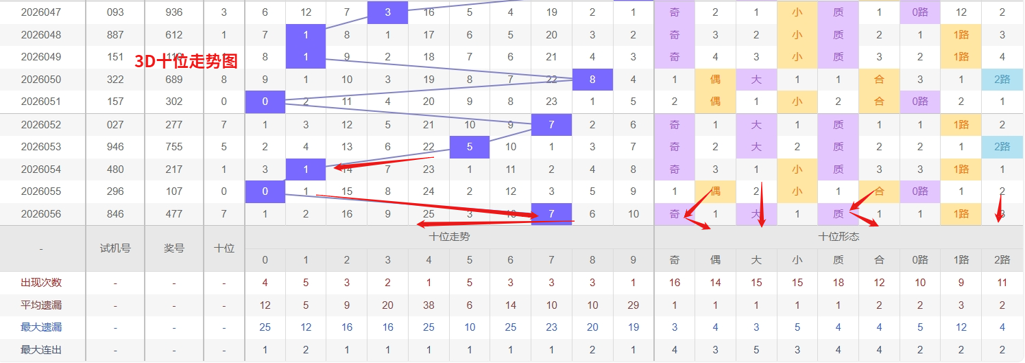 福彩3D十位分析:第2026056期十位开出号码7属大奇数号码后端。以历史100期数据为例十位奇偶比约为55比45,大小比约为51比49近期大小相差7点,根据求均衡的规律开出大数的概率比小数高一点。上期我们分析偶数经过连续回补后有走奇数的可能,开出奖号7大奇数符合我们的预期,近期3D十位走势来看,数字3和4作为冷号,目前遗漏期数已经较长,从号码平衡和回补需求的角度分析,近期反弹出现的可能性正在逐渐增加,需要防范冷态突然终结;与此同时,数字1作为当前的热号,出号频率明显高于其他号码,且走势上呈现出较强的连续性,接下来仍要重点关注其连开或再次热出的可能。综合来看,在十位号码的投注思路上,以热号1为主要关注方向,防守其热度延续,同时对于长期遗漏的3和4这两个冷号也要预留一定的关注度,适当防范它们随时可能出现的回补,以应对十位冷热转换的节奏,所以福彩3D第2026057期十位推荐13458。