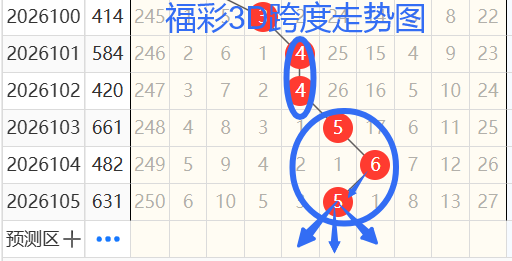 2)我们来看跨度:还是以101期——105期为例,如图依次是44565跨度,按照路数转换关系来看,那么跨度我们暂定369258跨 ,本期个人比较看好4 5 6跨。