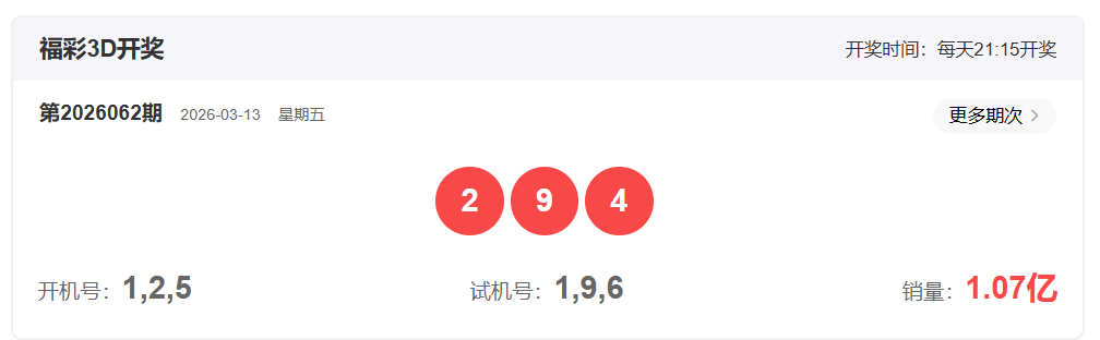 福彩3D2026062期开奖号码为294,形态为组六,奇偶比12,和值:15,跨度7,大小比12,【012路个数比】1:1:1
