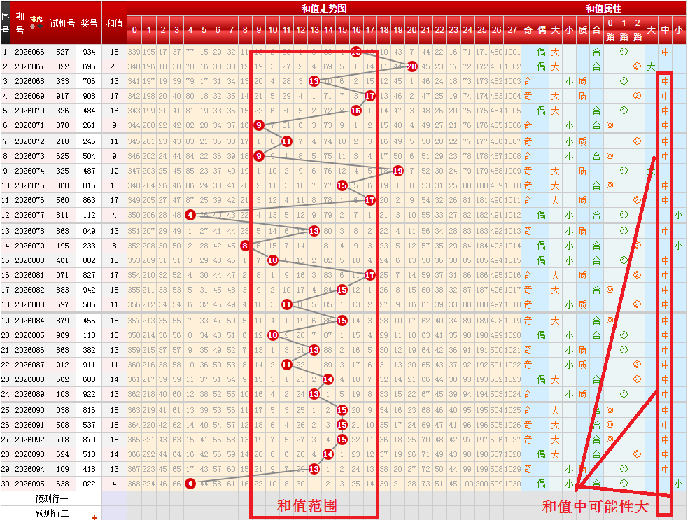 从上图可以开出,按和值大(18-27)中(9-17)小(0-8)分区,上期开出和值中4,按近期趋势和跟随表现,本期和值中可能性大,和值大致在9-17间。