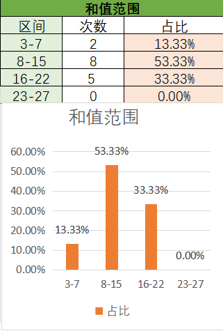 上期和值是17,处在16~22之间,16~22占比变大,8~15占比变小。目前是8~15占比最优,次之是16~22,然后是3~7,最后是23~27。本期看好和值在8~15之间,其次是16~22。