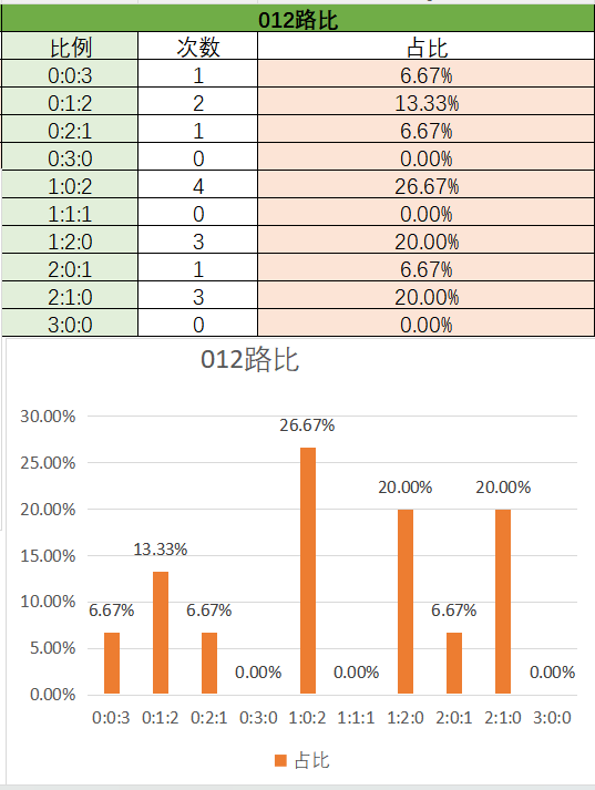 上期012路比是1:2:0,其中1:2:0占比变大,1:1:1占比变小。近15期内,1:0:2是开出最多的,然后是0:1:2,2:1:0,1:1:1,最后是0:2:1,2:0:1,0:0:3。总的看2路最热门,其次是1路,最后是0路,本期看好1:1:1和2:1:0。