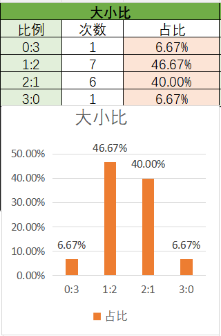 上期大小比为2:1,其中2:1占比变大,1:2占比变小。可以看到近15期内1:2优势最好的,其次是2:1,最后是3:0,0:3。本期看好2:1开出,其次是1:2。