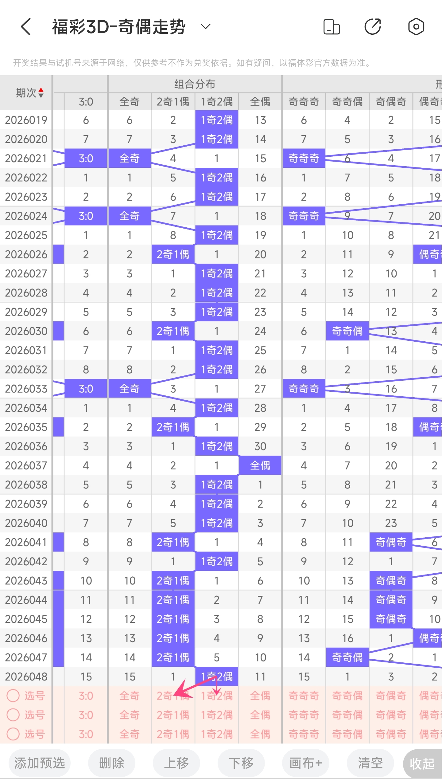 上期开了1奇2偶的情况,往前一期开出的是2奇1偶。从组合数学理论上来讲,开出2奇1偶和1奇2偶的概率都为37.5%,开出全偶和全奇的概率为12.5%。通过分析目前30期内的数据。本期的开出全偶的概率是3.33%,开出全奇的概率为10%,开出1奇2偶的概率为56.66%,开出2奇1偶的概率是30%。和前一期相比,概率没有变化。通过走势图分析,上期开了1奇2偶,本期看好2奇1偶。所以本期推测可能开2奇1偶,其次是1奇2偶,然后是全奇或者全偶类型。