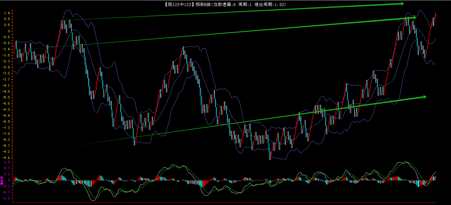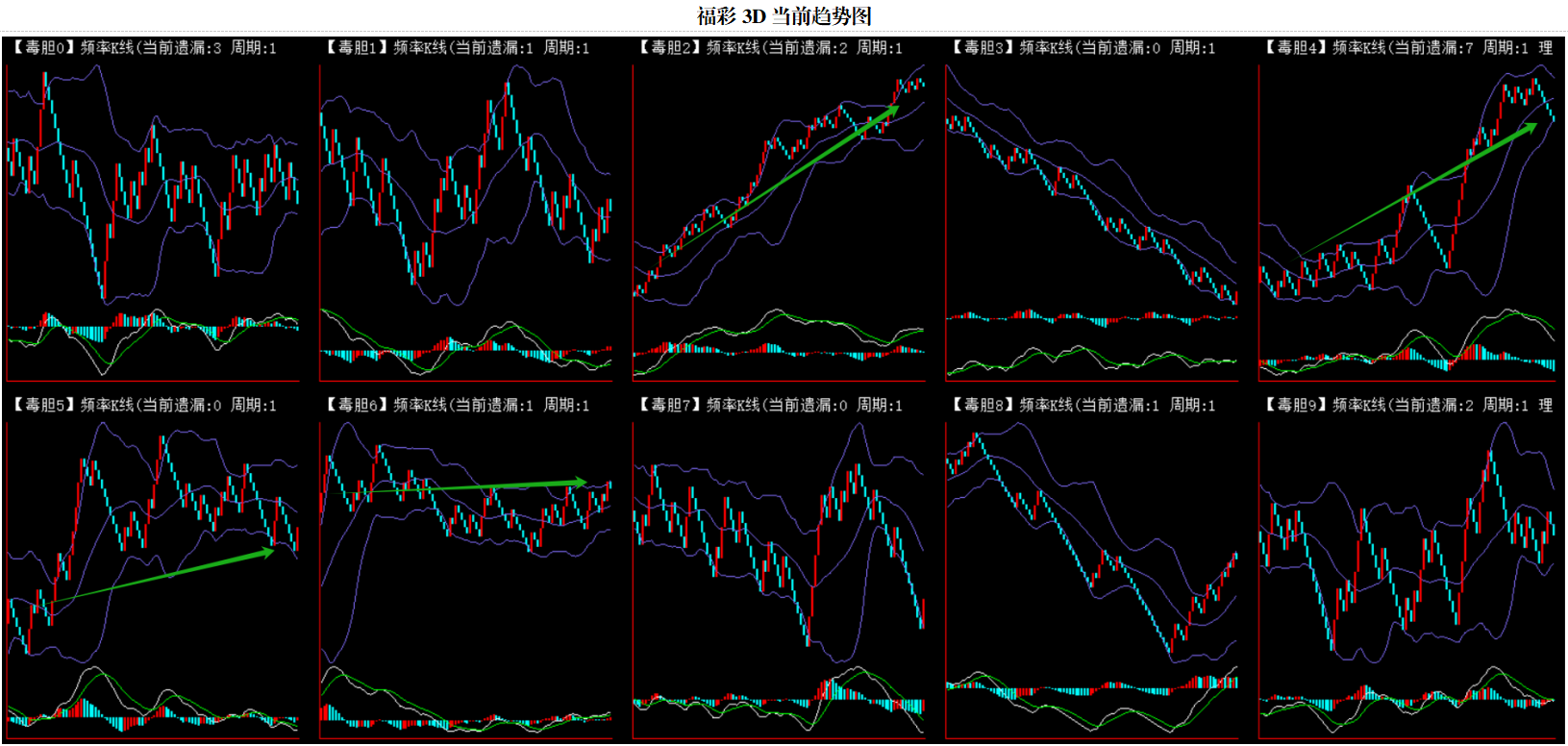整体趋势上行,上边沿线趋势向上,下边沿趋势也是向上,节点震荡,当前遗漏1期,本期关注。