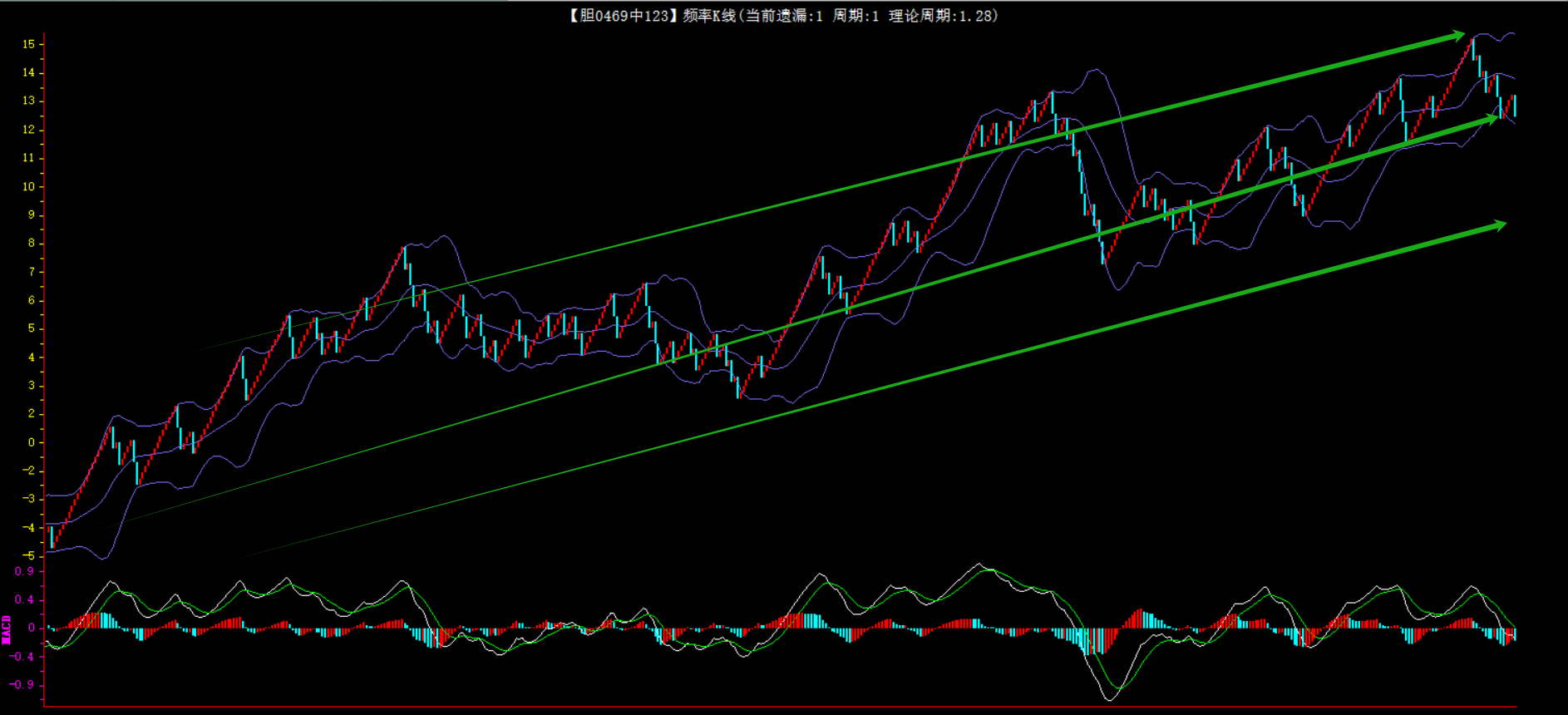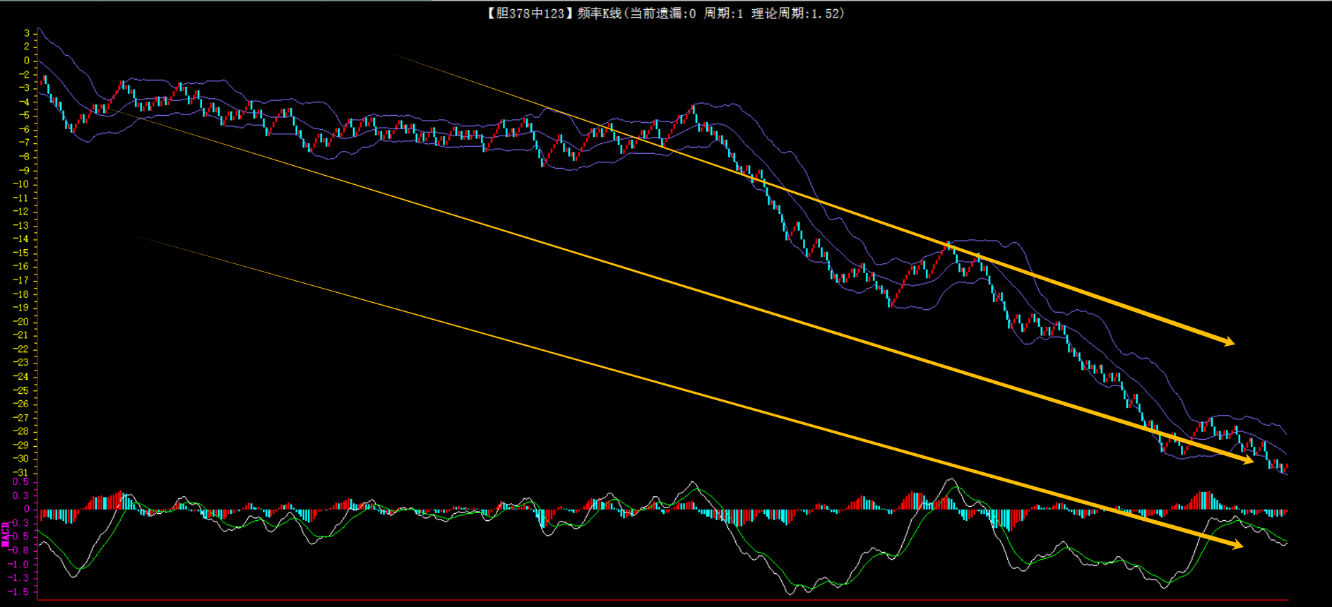 整体趋势下行,上边沿线趋势向下,下边沿趋势也是向下,节点震荡,当前连开2期,本期防守。