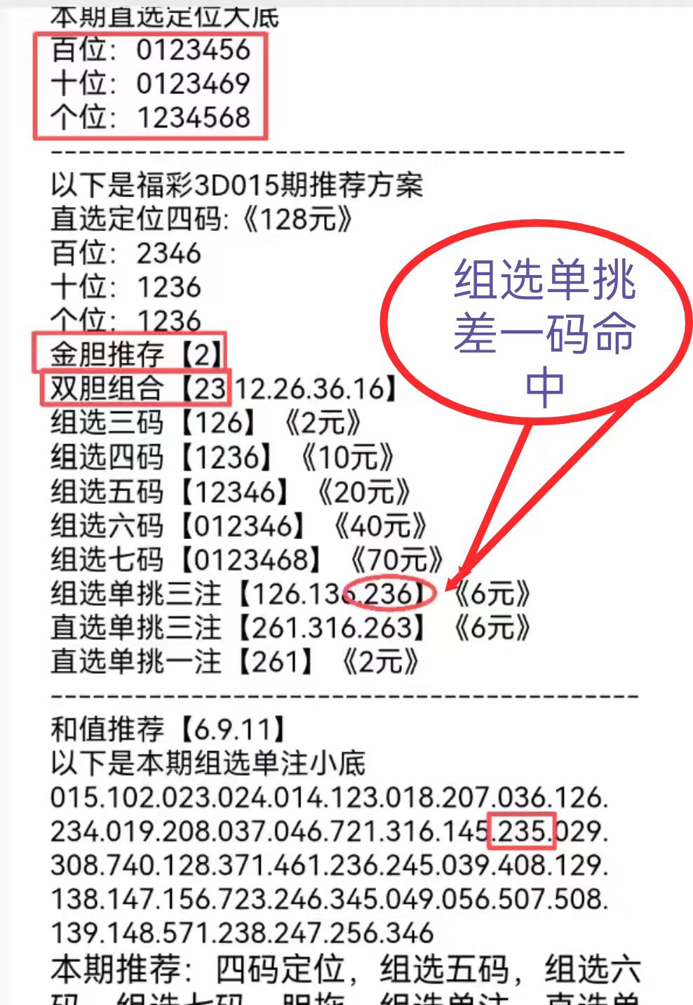 015期:专区金胆双胆全部命中,直选定位命中直选532,组选单注小底命中235