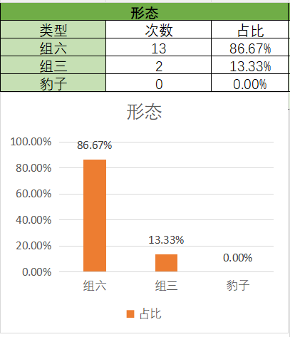 上期开的是组三,各个类型占比没有变化。通过图示可以看到,组六在15期内开了13期,组三开了2期。本期关注组六,防组三