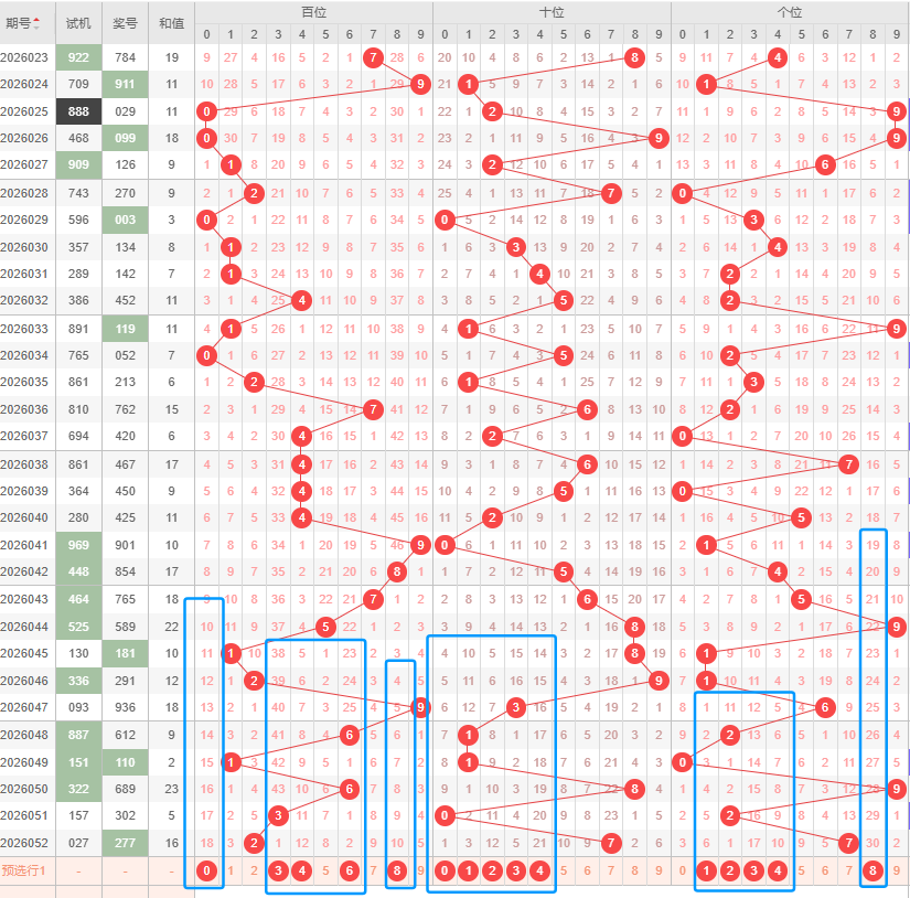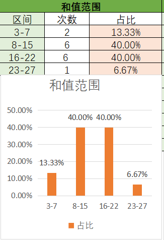 上期和值是16,处在16~22之间,其中16~22占比变大,3~7占比变小。目前是16~228~15占比最优,然后是3~7,最后是23~27。本期看好和值在8~15之间,其次是16~22