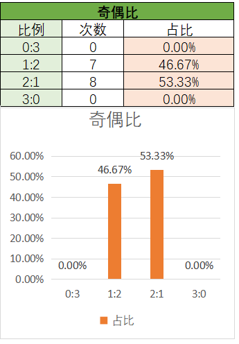 上期奇偶比为2:1,其中2:1占比变大,0:3占比变小。近15期内2:1优势最好,然后是1:2上期开了2:1奇偶比,本期看好1:2奇偶比的开出,其次是0:3