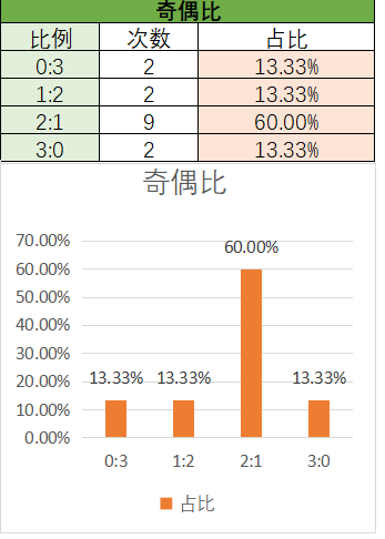 上期奇偶比为2:1,各个类型占比没有变化。近15期内2:1优势最好,然后是1:2,3:0,0:3。上期开了2:1奇偶比,本期看好1:2奇偶比的开出,其次是2:1。