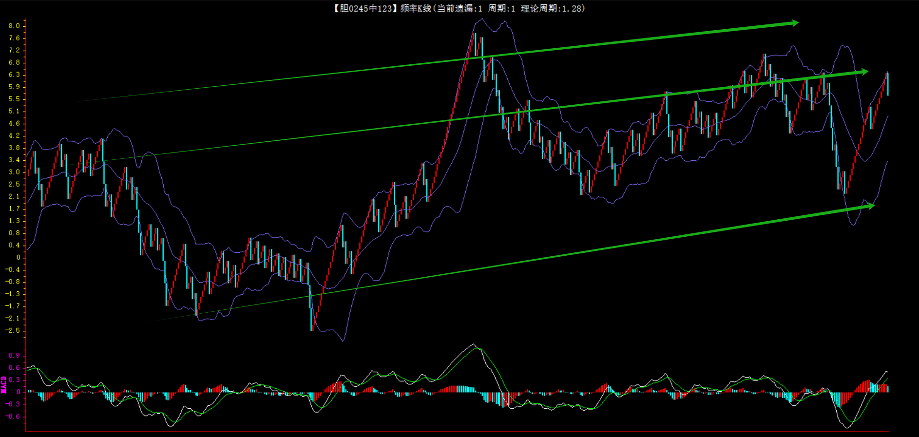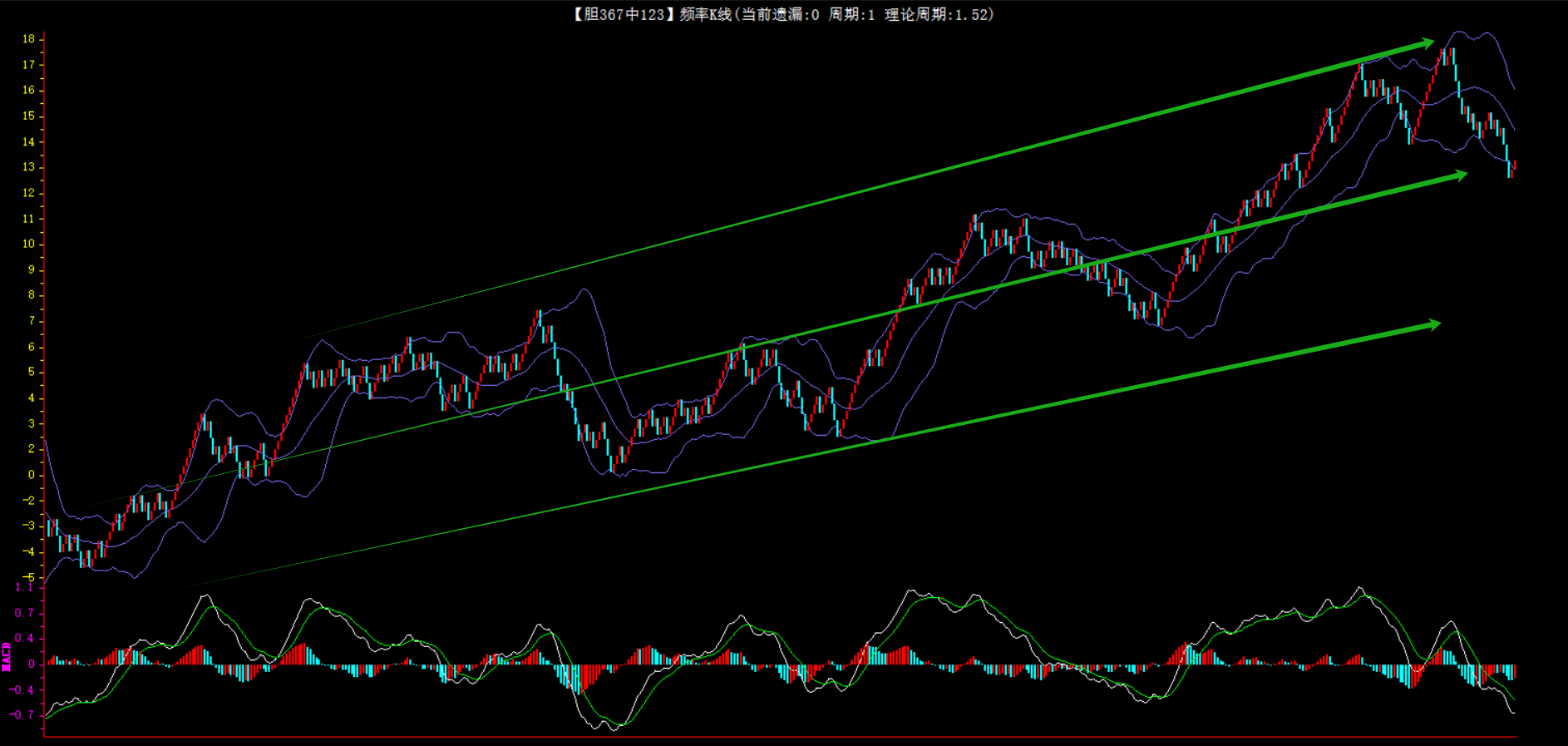 整体趋势下行,上边沿线趋势向下,下边沿趋势也是向下,节点震荡,当前遗漏2期,本期防守。