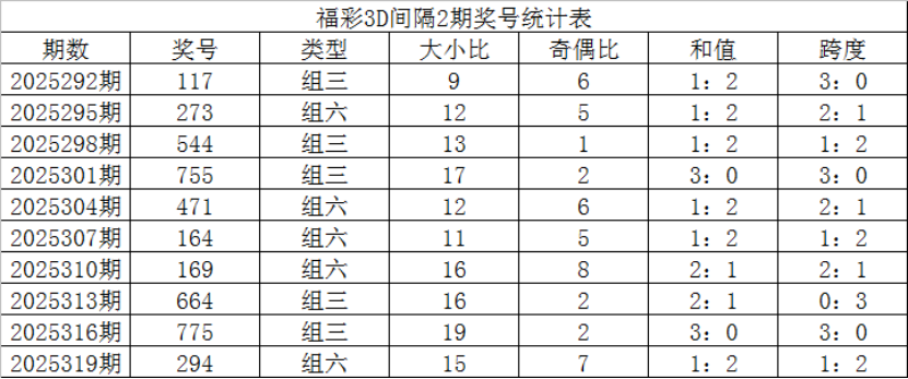 跨度分析:最近10期跨度分别开出:3、2、8、7、2、3、4、7、1、4,跨度分布在1 - 7区间,振幅为7点,分布较广,其中跨度2、3、4、7出现2次,1、8出现1次,其余跨度没有出现,上期开出跨度4,走高3点,本期预计跨度走高,关注跨度6。