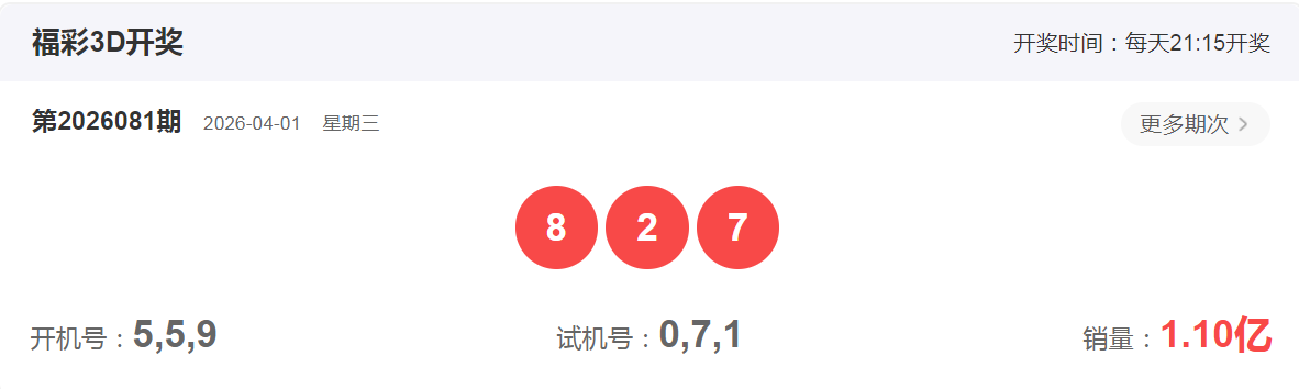 福彩3D2026年4月1日第081期开奖号码是827,和值17,跨度6,偶偶奇,大小大,组六形态
