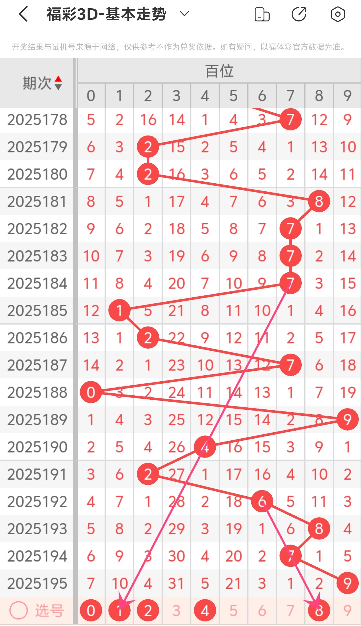 上期十位开出8,本区与上期的跨度为6,本期我们可以从上面走势图中看出选号的思路,0为斜连走势跨度为八,3为斜连走势跨度为五,8为重码,综合以上分析,本期十位推荐:03568