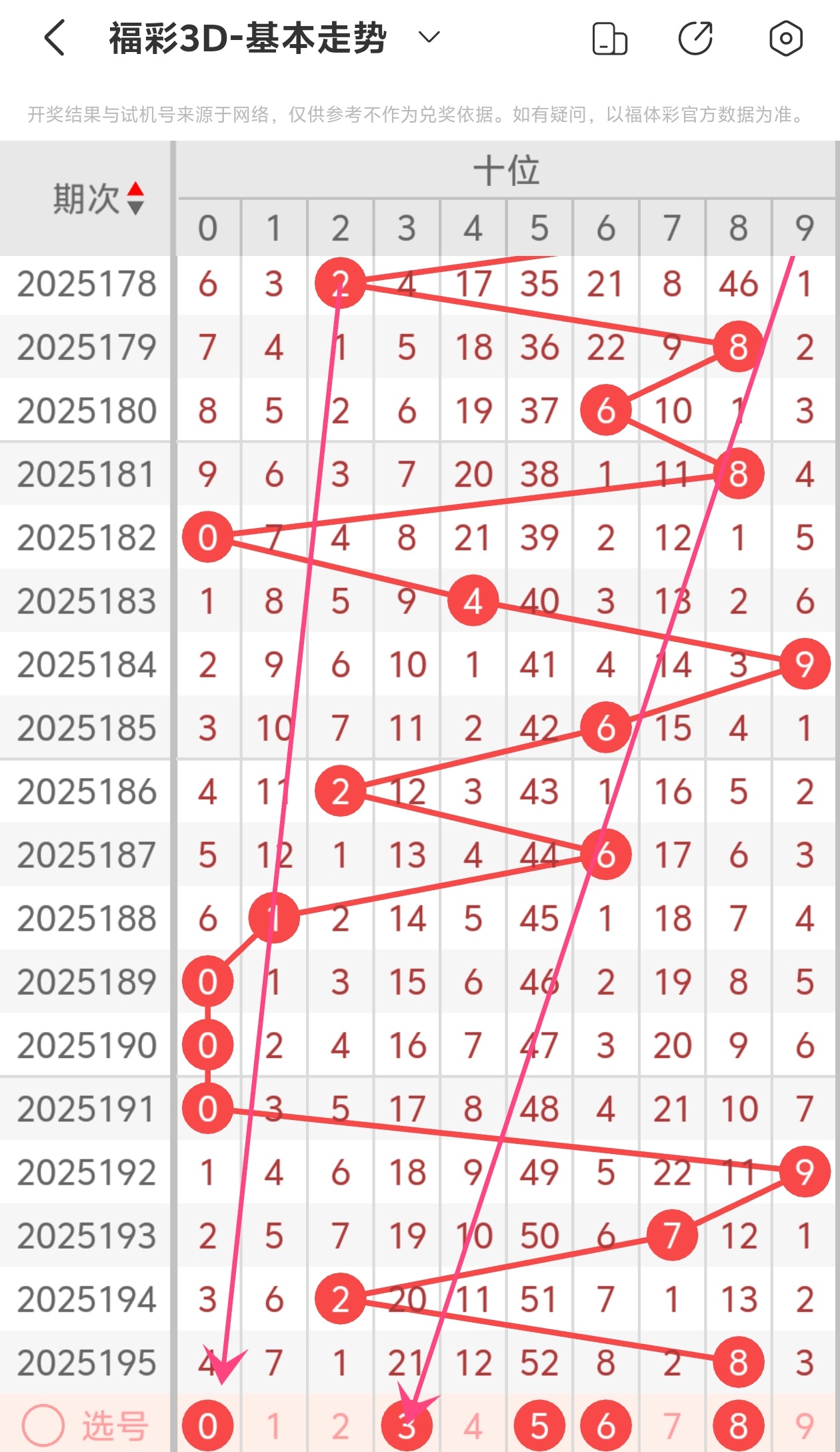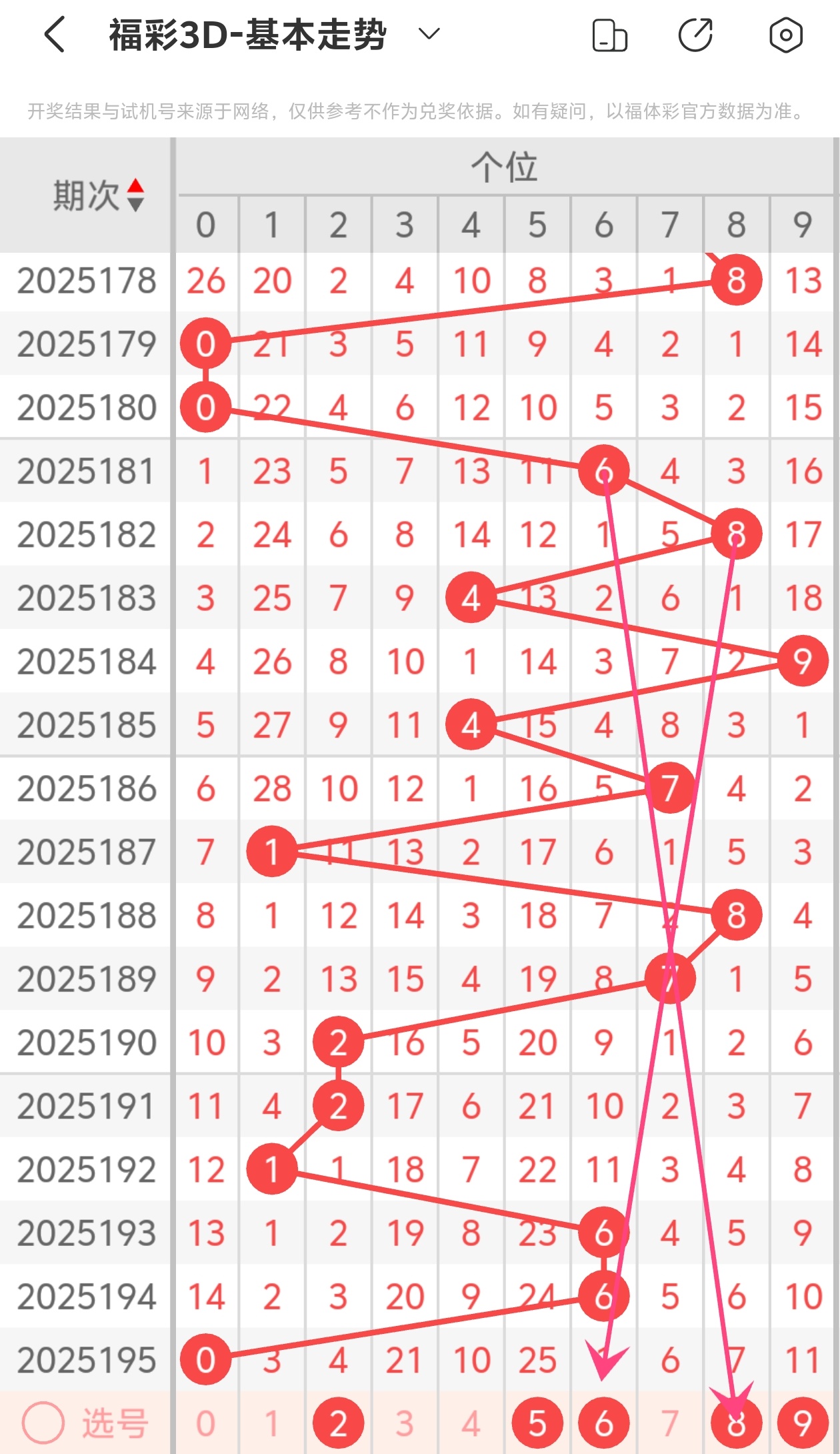 上期个位开出0,本区与上期的跨度为6,本期我们可以从上面走势图中看出选号的思路,6为斜连走势跨度为六,8为斜连走势,综合以上分析,本期个位推荐:25689