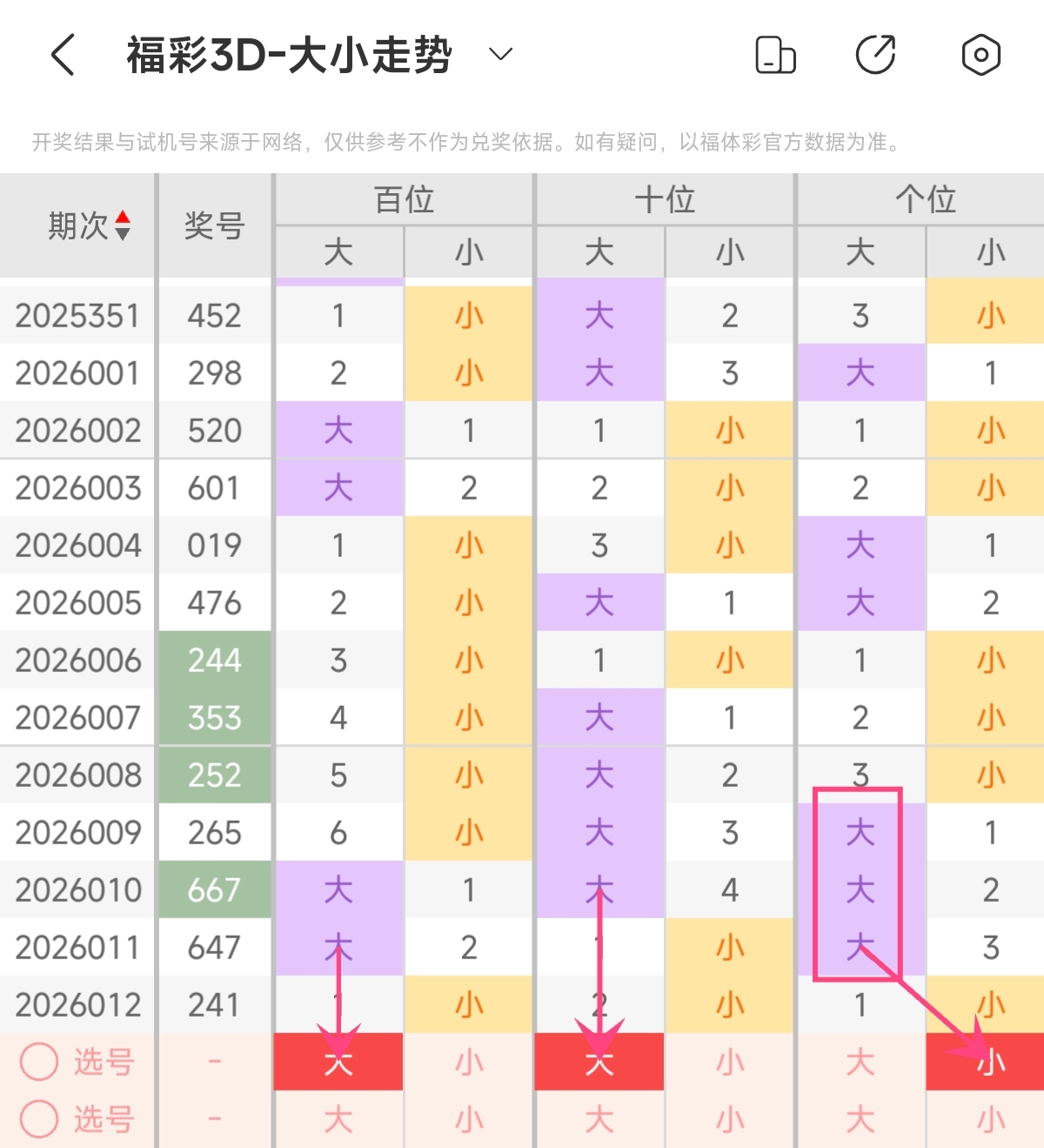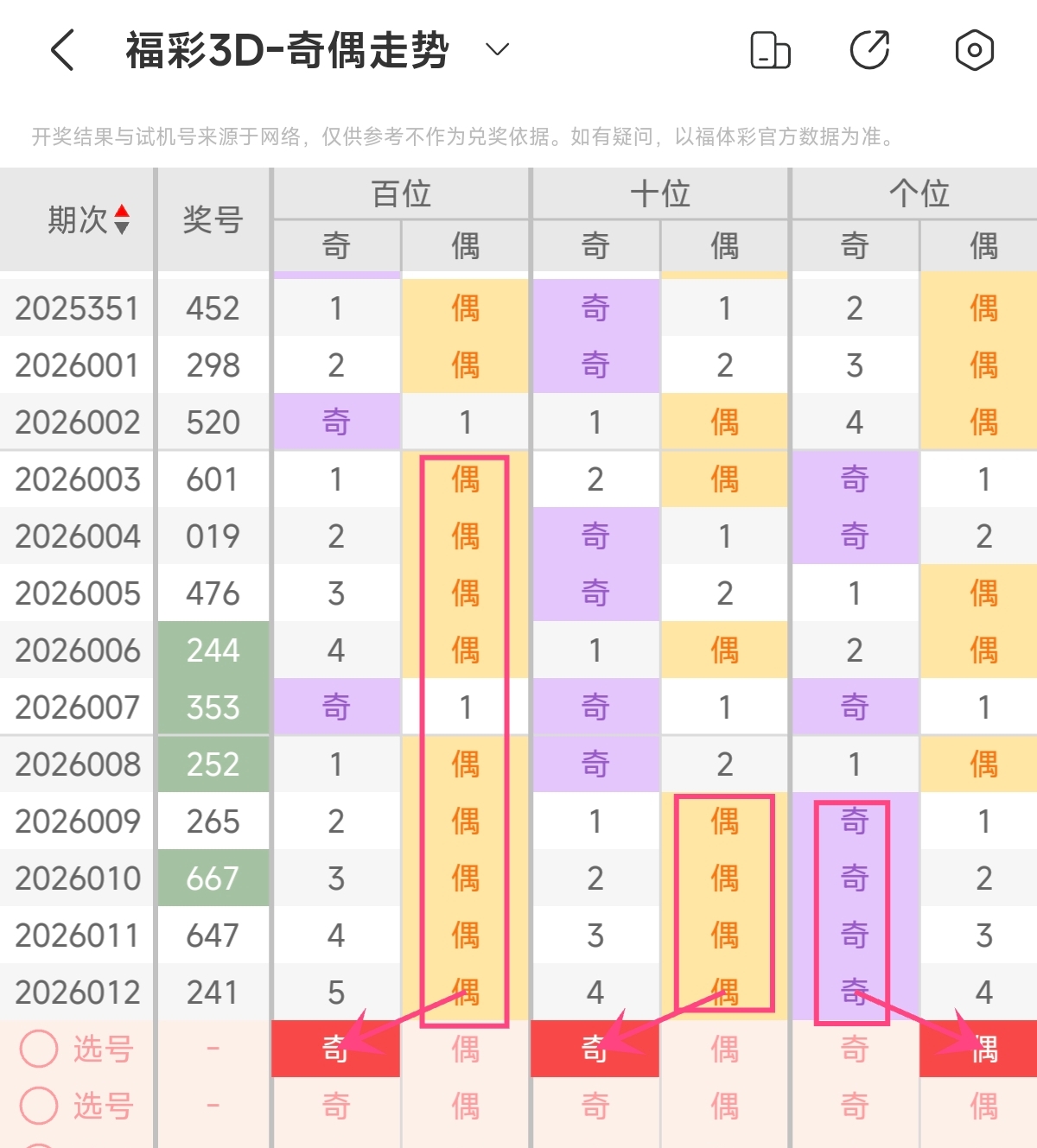 首先让我们回顾一下上期福彩3D第2026012期开奖号码为241 ,为组六形态,大小比为0:3,奇偶比为1:2,跨度为3,和值为7。