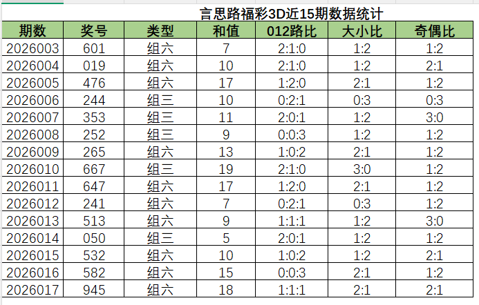 上期012路比是1:1:1,其中1:1:1占比变大,1:0:2占比变小。近15期内,2:1:0是开出最多的,然后是1:0:2,2:0:1,0:2:1,1:2:0,0:0:3,1:1:1。总的看2路最热门,其次是1路,最后是0路,本期看好1:1:1和2:0:1。
