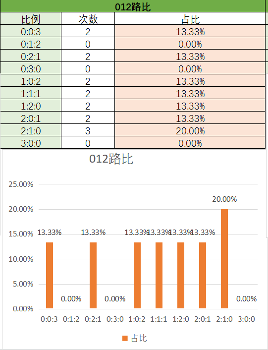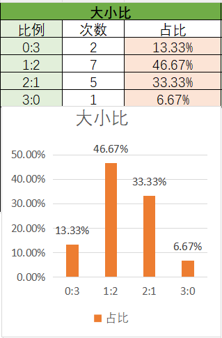 上期大小比为2:1,其中2:1占比变大,1:2占比变小。可以看到近15期内1:2优势最好的,其次是2:1,然后是0:3,最后是3:0。本期看好1:2开出,其次是2:1。