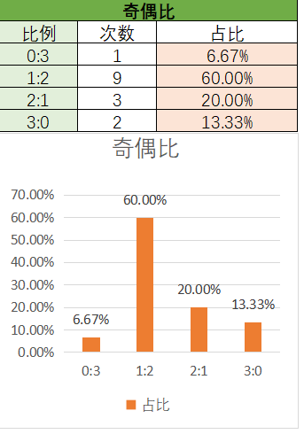 上期奇偶比为2:1,其中2:1占比变大,1:2占比变小。近15期内1:2优势最大,其次是3:0和2:1,最后是0:3。上期开了2:1奇偶比,本期看好1:2奇偶比的开出,其次是2:1。