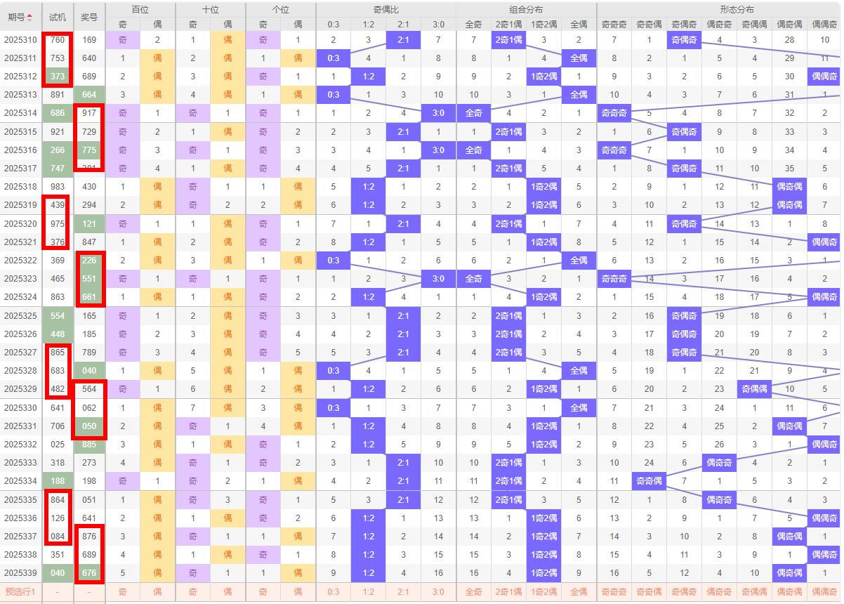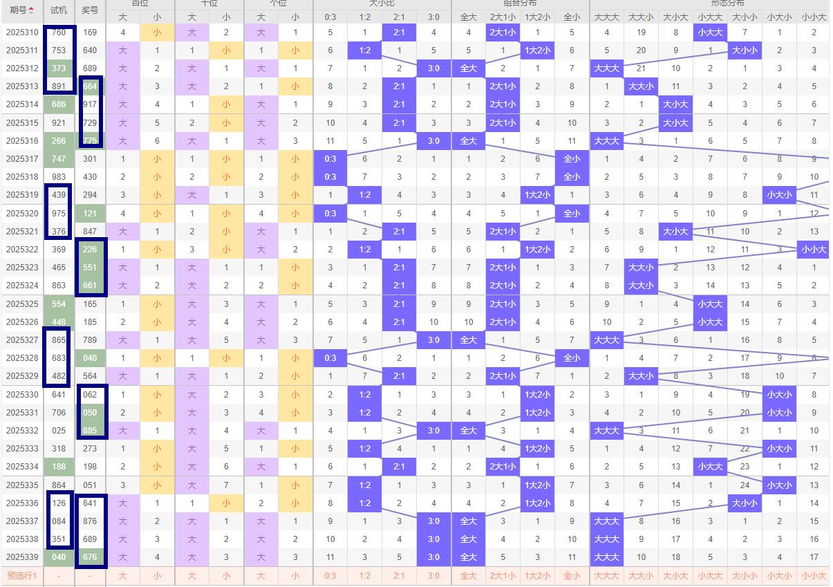 大小走向分析 根据339期开奖号码676,可以看到大小形态为大大大。在最近的走势中,大小号码开出比例基本持平。因此,对于340期,可以预判大小号码继续维持均衡状态,关注大小比1:2的组合。近十期大小比为19:11防两小一大.