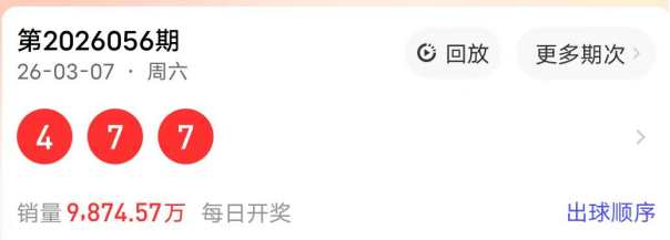 2026056期开奖号码为477,奇偶值为21偶;大小值为21小;012路走势为111路;跨度为3跨;和值18点;组三形态。