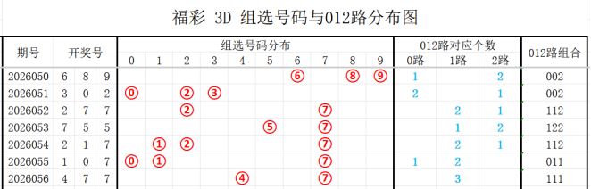 7期(050~056)开奖号与012路组合分别为689(002)、302(002)、277(112)、755(122)、217(112)、107(011)、477(111)上期开奖号为111路组合,根据整体走势分析,本期看好的012路组合有:011、002、001,022、012、222组合。