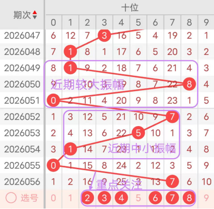 7期(050~056)开奖号十位号码球分别为8、0、7、5、1、0、7,开奖号与上一期走出的振幅分别为7、8、7、2、4、1、7,050期走出8号大数号码球,走出“7”的大幅度,051期走出0号小数号码球,走出“8”的大幅度,052期走出7号大小数号码球,走出“7”的大小幅度,053期走出5号中大数号码球,走出“2”的小幅度,054期走出1号中小数号码球,走出“4”的中小幅度,055期走出0号小数号码球,走出“1”的小幅度;056期走出7号大数号码球,走出“7”的大幅度,从振幅大小及走势图的整体对应来看,中大振幅走在4~5之间较为适宜,中小振幅走在0~3之间较为适宜;结合走势图的上下对应及振幅大小分析,本期十位应重点关注号码球为2、3、4、6、7、8