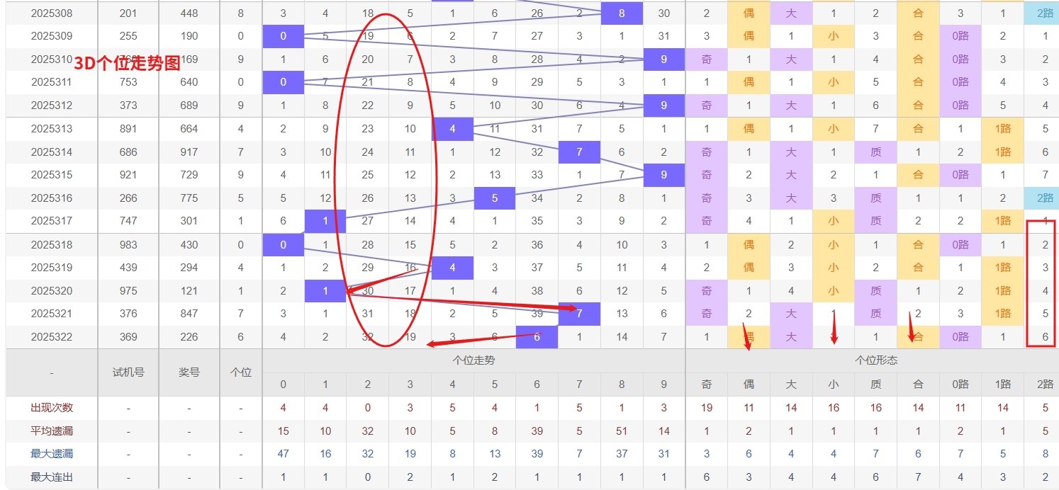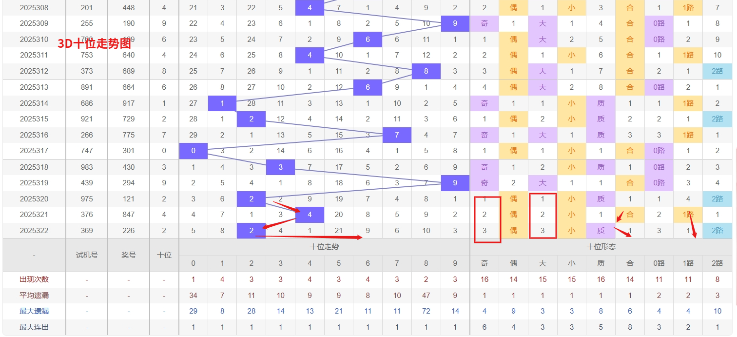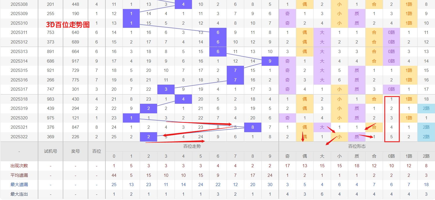 福彩3D个位分析:第2025322期个位开出号码6属于大偶数前端,从以上个位走势图中可以看出近100期的大小比约为49:51奇偶比约为52:48大小奇偶数据上有点差异有需求但不是太明显,不太好看这时就要借助连线走势和遗漏数据来帮助我们缩水号码。上期个位落号“6”大偶数0路号码球,号码开出了1振幅,连续多期的大振必被小振幅取代幅符合我们的预期,那么本期我们在个位考虑振幅走势走前依然要转变思路考虑大振幅,具体考虑(1-5)个振幅是我们主要的方向,那么在对个位落号情况进行系统的分析时我们可以明显的看到个位号码走势呈现大范围震荡,尤其是在号码的落位特点上表现的尤为突出,那么本期我们在个位分析时就要注意号码的风险,避免出现踏空。从3D个位近期走势分析,数字2和8均处于明显的冷态区间,遗漏期数较长,按照号码平衡规律,冷极必反是常态,因此2和8在个位上的回补需求正不断增强,需密切关注其解冻信号。与此同时,数字4和5则表现强势,频繁开出形成稳定的热号态势,这种热度往往具备一定惯性,短期内防其持续走热是关键。综合来看,个位呈现“冷热对峙”格局,在重点防守热号4和5惯性延展的同时,对冷号2和8的可能反弹保持警惕,尤其是热号间歇期往往是冷号回补的良机,因此福彩3D第2025323期个位看好23458。