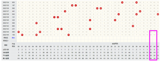 上图清晰的标注了47和48组合的走势情况,通过图表可以看到47组合目前遗漏90期,最大遗漏是94期,48组合当期遗漏是104期,最大遗漏值是148期,那么这些信息代表着什么?我们如果把47和48组合看成一组合,把它们转化成单选号码它们单选号码一共是102注,那么此时就有了一个概念,102注理论上几乎是10天开出一次,那么实际值呢?通过数学系数换算,就可以得到100注号码开出的极限值一般不会超过100期,换言之就是说47和48组合目前遗漏是90期,那么它们在10期之内必然会有大概率中出的机会,这样的机会一定要把握住。