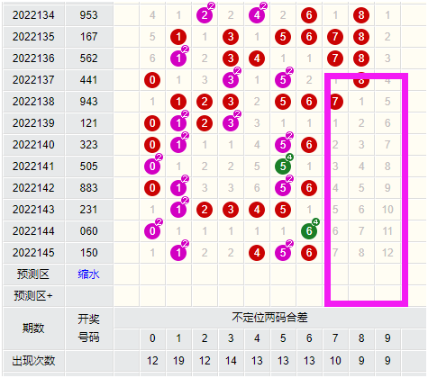 我们看到近期福彩3D的两码合差走势图表,我们可以看到两码合差里几乎是看不见7、8、9的开出的,这就是意味着近期两码合中出7、8、9的概率也是非常之大,如果此时用两码合以及47、48组合两者结合起来分析,大家就会发现号码会速度减少,从102注,直接变成几十注单选号码,这样的结合才是最完美的选择,大家不要错过机会,近期福彩3D可以考虑从这两个方面入手。