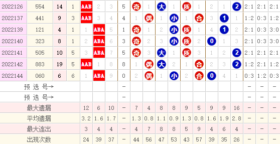 我们首先看到上图,我们都知道组三形态可以分为AAB、ABA、ABB这么三种形态,近期福彩3D里从137期到144期8期之间开出了6个组三对子号码,它们的形态分别是AAB和ABA,既然组三号码是分三种形态,自然还有一种形态就是ABB型号的组选3号码是近期一直未开的,因此我们得到第一个信号就是如果在开出组三,就应该关注ABB型号的号码开出,即就是关注对子号码开出在十位和个位上,这样的组三模式是未来必须要参考的。